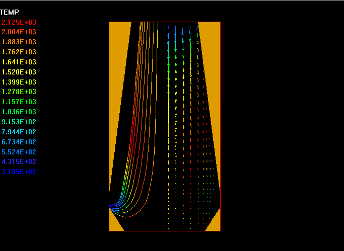 The plots show the flow distribution, mixture composition as represented by the model, gas and lump temperature and velocities within the chamber.