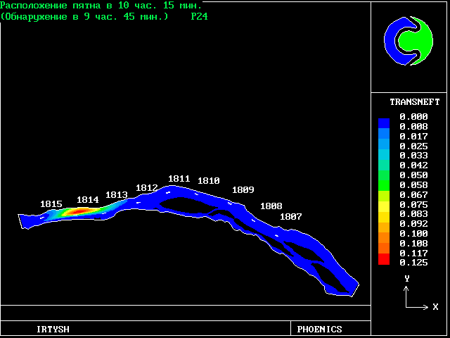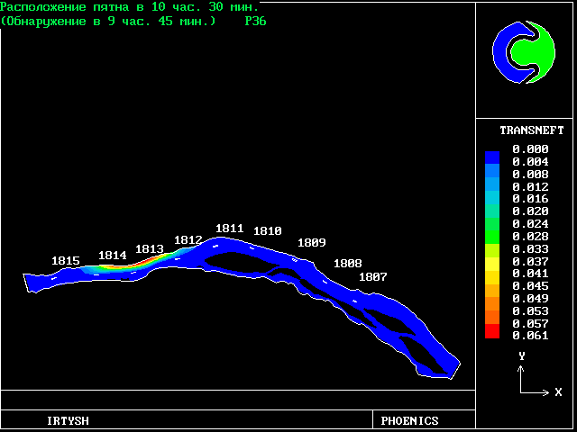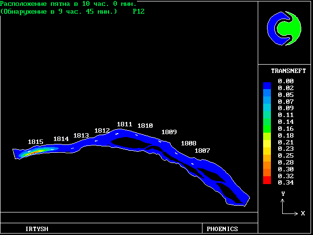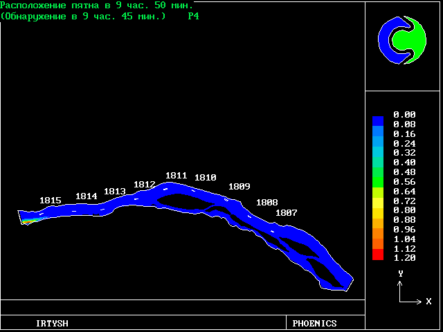 The predicted results are in good agreement with the measurements, although the length of the slick is underpredicted. The time for the slick to arrive at a fixed point downstream was predicted very accurately, ie to the nearest minute for a 90-minute travel time.