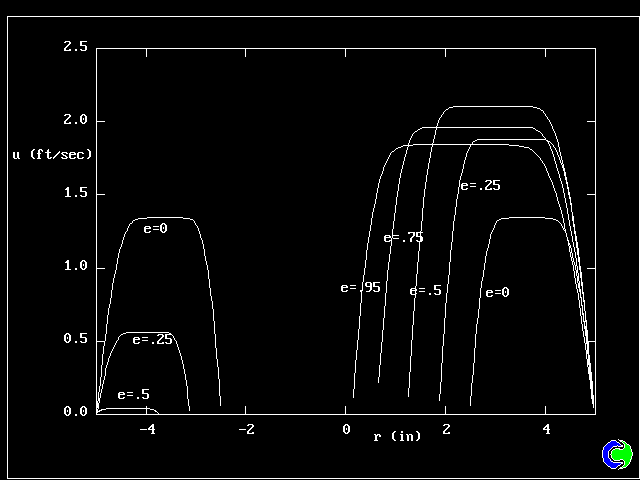 We can notice the effect of increasing eccentricity: The velocity in the narrowing part of the annulus is reduced, while the fluid is rushing into the widening part (fig. 6). For high eccentricities (greater than .5), there is a high velocity plug (flat velocity profile) in the wide part of the annulus, while a no-flow (stagnant) region is created in the narrow part.