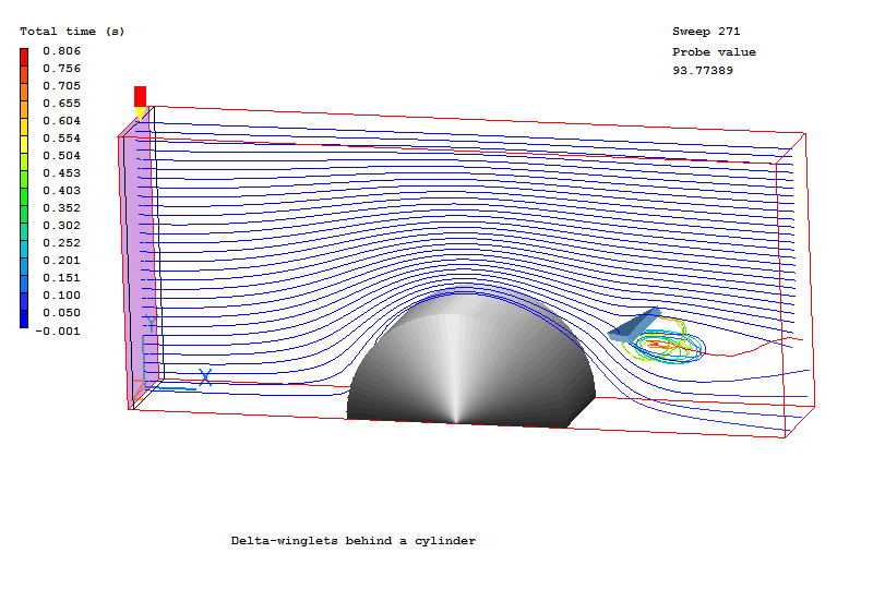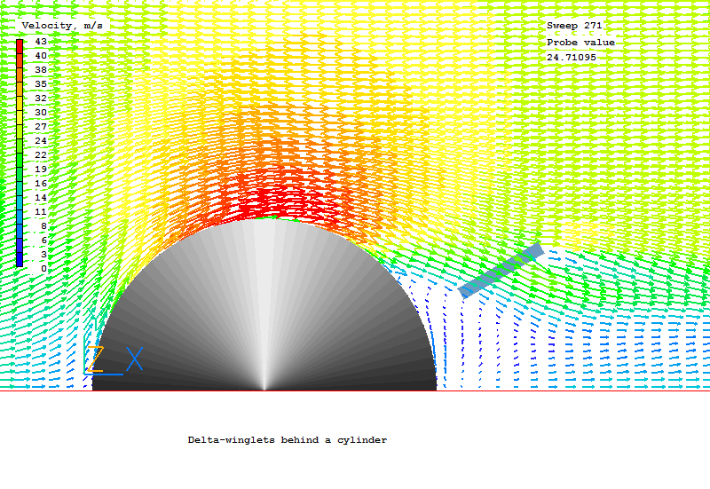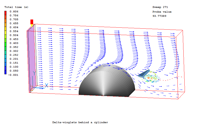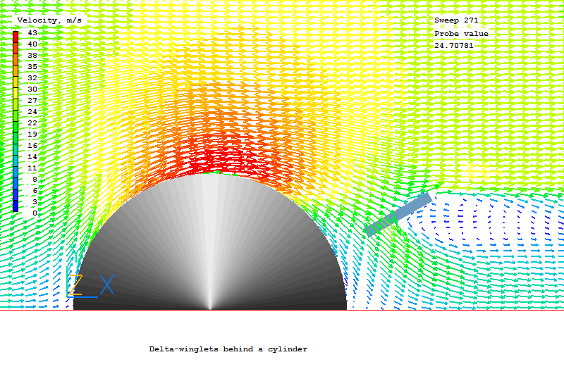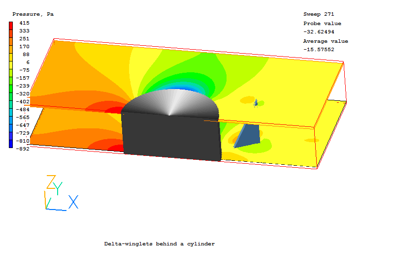 The demonstration case considered consists of a half of cylinder placed in an air flow within a rectangular duct. The delta-winglet is mounted on the wall behind a cylinder. The position of the wingle tip is a half of cylinder diameter relative to the center of cylinder. The right triangle winglet with a hight equal to the duct width has an angle of attack of 45 degree.