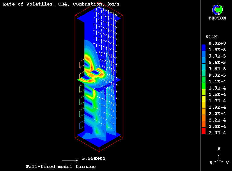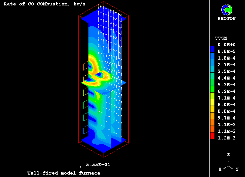 Turbulent combustion of volatiles is modelled via two-step reaction of hydrocarbon oxidation, in which carbon monoxide is an intermediate product.