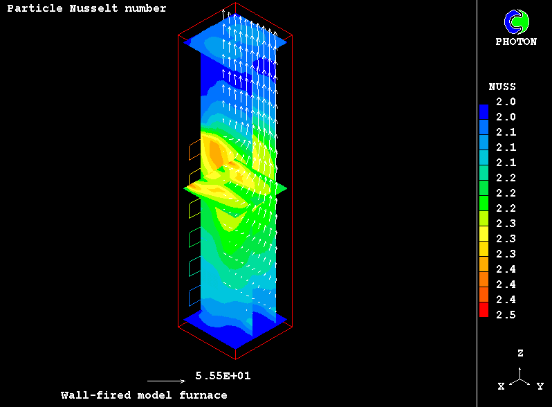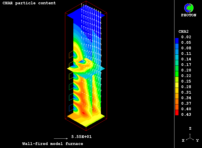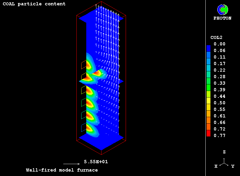 The case presents the implementation in PHOENICS of an IPSA based model for non-equilibrium two-phase reactive flow of combustible particles finely dispersed in the carrying air stream. The model uses the Eulerian description of the two interpenetrating continua with the transfer of heat, mass and momentum between them. The processes accounted for are particle drying, the volatilisation of dispersed phase material, gaseous exothermic oxidation of volatile products, heterogeneuos combustion of particle char and NOx formation.
