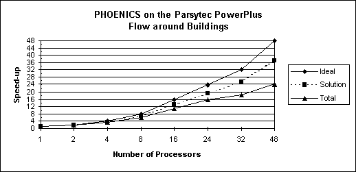 The 'Solution' curve is the speed-up obtained from measuring the solution time (including communication overheads), but excluding the time taken to write the results to a file.