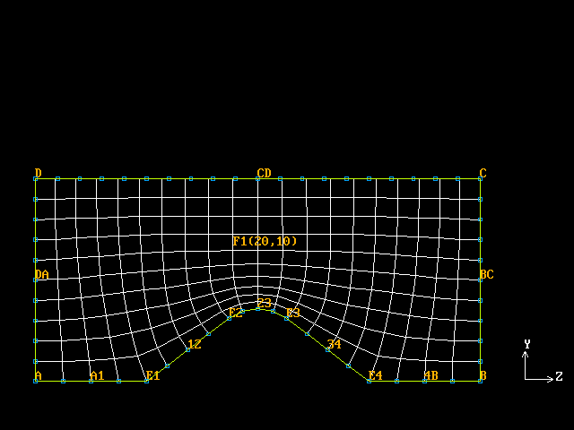 GSET(L,A1,A,E1,4) GSET(L,12,E1,E2,4) GSET(L,23,E2,E3,4,ARC,0,Y2,0) GSET(L,34,E3,E4,4) GSET(L,4B,E4,B,4) GSET(L,BC,B,C,10) GSET(L,CD,C,D,20) GSET(L,DA,D,A,10)